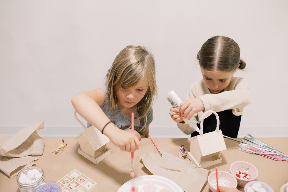 After the yoga practice, the kids moved on to doing a craft. I had sourced and brought all the supplies for the art portion of the party, but if this isn't your thing, Wymbin will partner with you on these activities and details! Clover and her friends painted wooden fairy houses and then filled them with moss, rocks, feathers, sequins, and little fairy figurines. It was a hit!